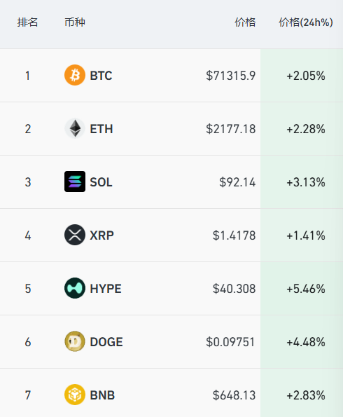 加密货币集体拉升,比特币涨超2%,报7.1万美元/枚。过去24小时,全市场超7.6万人被爆仓。