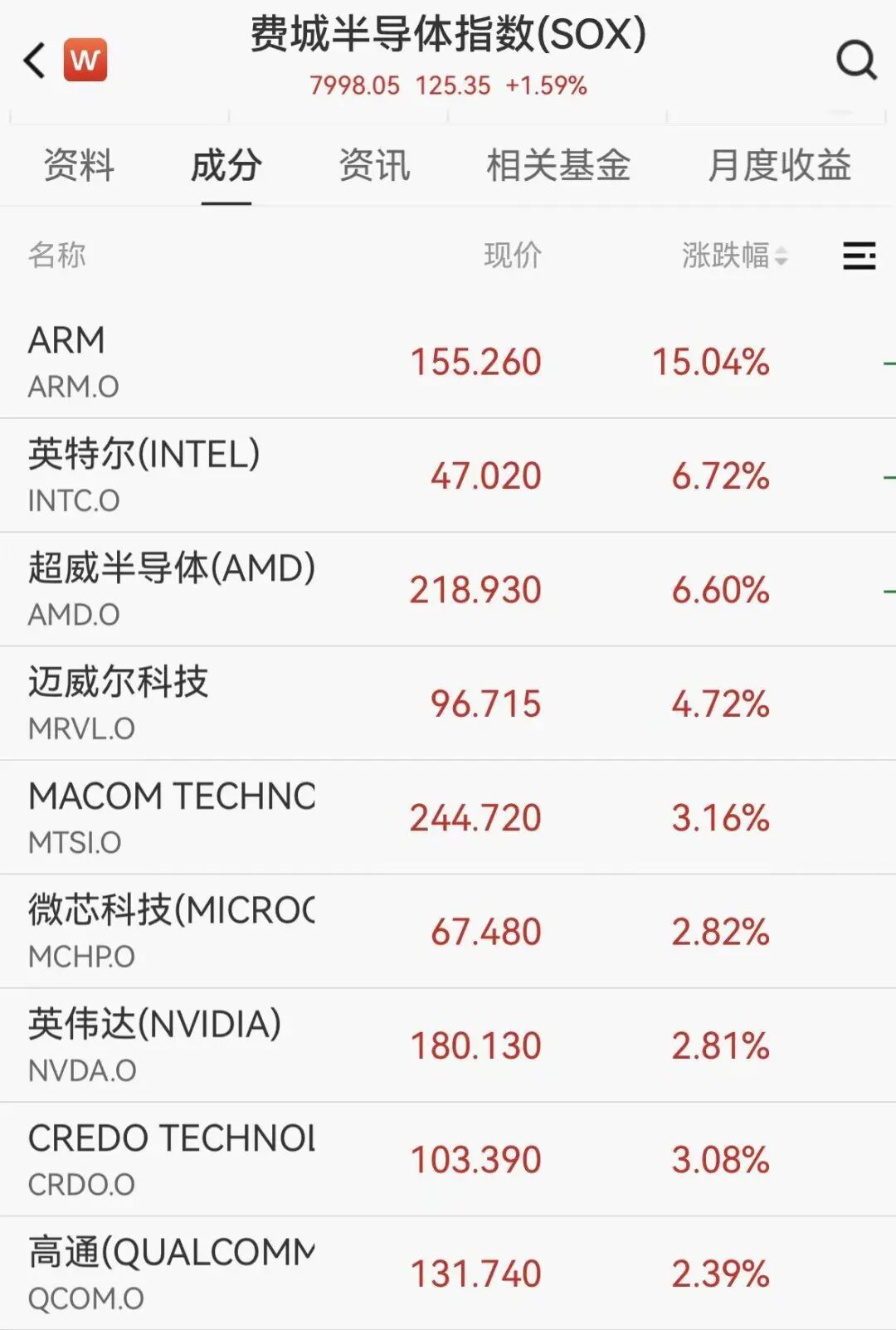 芯片股走势强劲,费城半导体指数涨近1.6%,ARM大涨超15%,消息面上,据财联社,ARM发布自研数据中心CPU并获Meta首批采用,RBC同步上调目标价至175美元。AMD、英特尔涨超6%,迈威尔科技涨超4%。